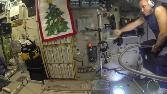 Russian astronaut flying on a vacuum cleaner in ISS