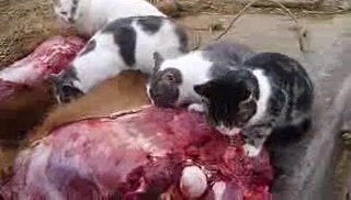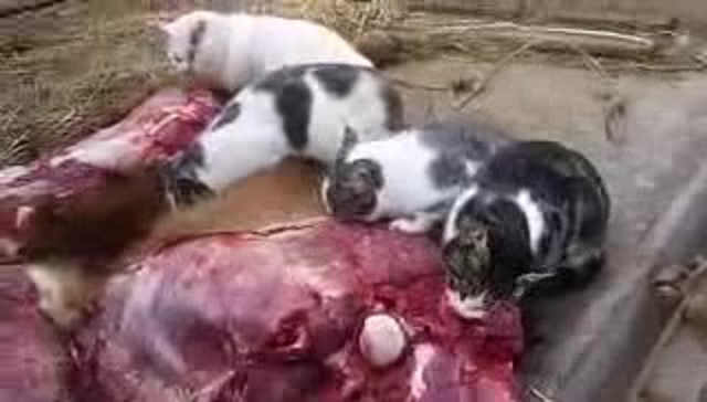 Коты едят сырое мясо