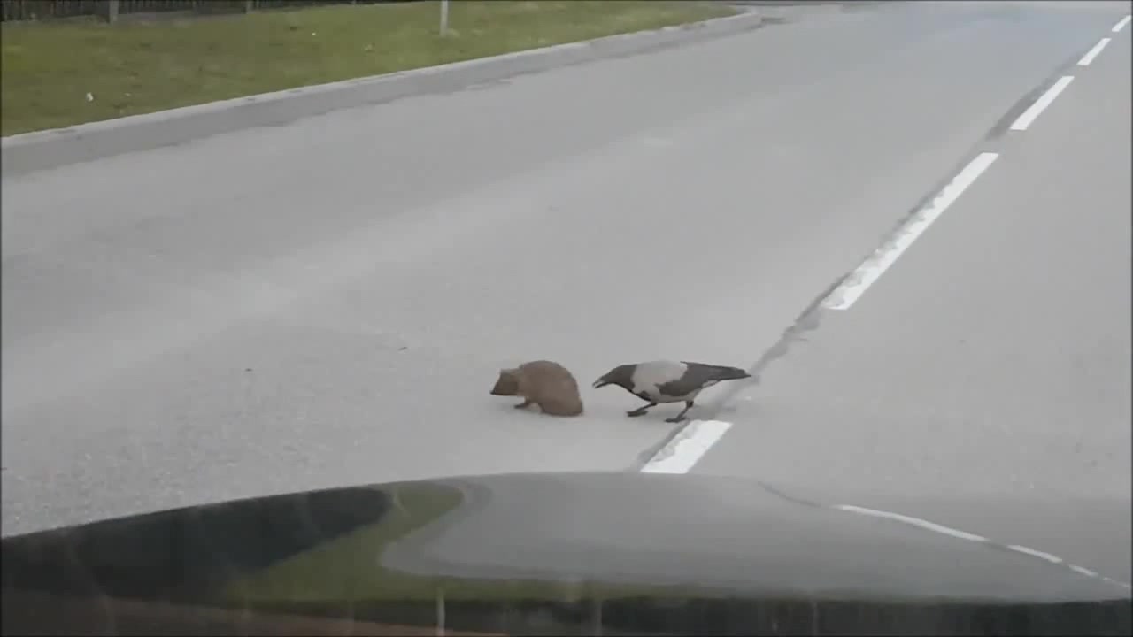 crow helps hedgehog