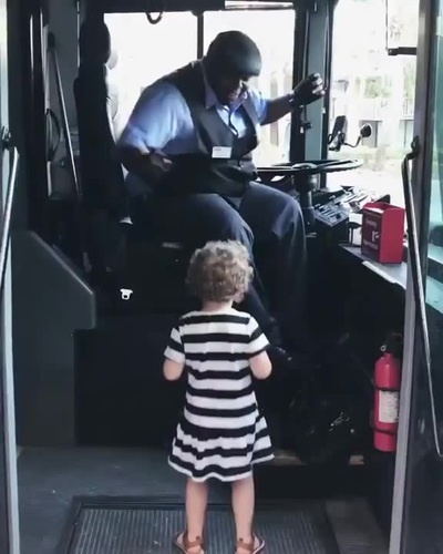 Bus driver dancing together with a girl's