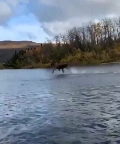 Лось бежит по воде.