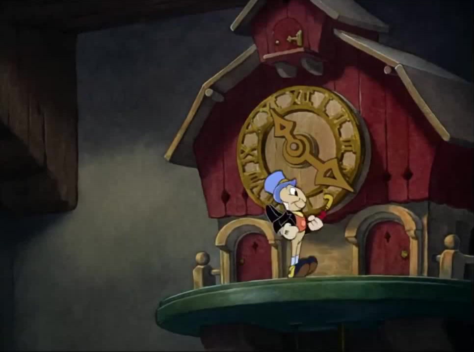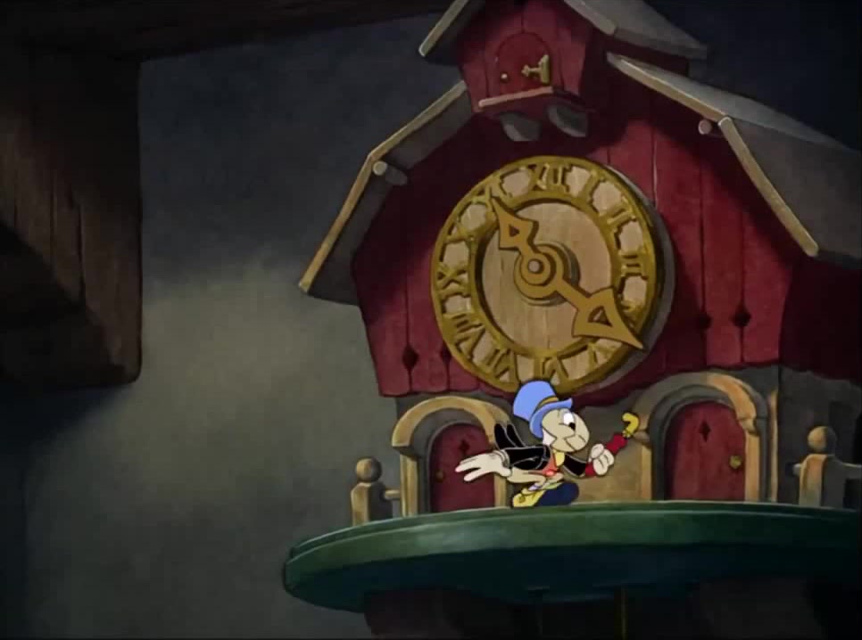 Jiminy Cricket is in the tap dancing on the cuckoo clock