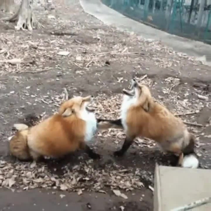 Two foxes laugh