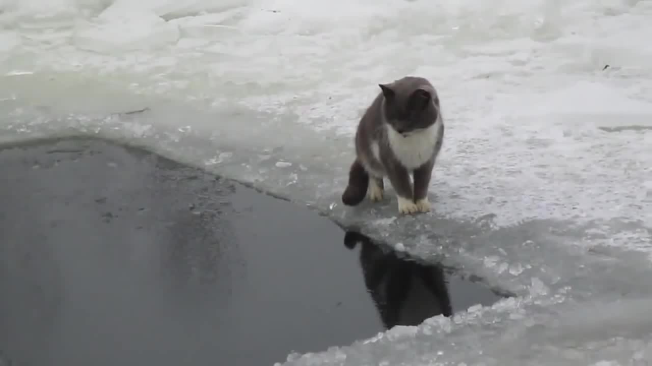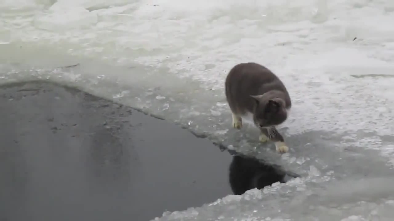 кот ловит рыбу в ледяной проруби