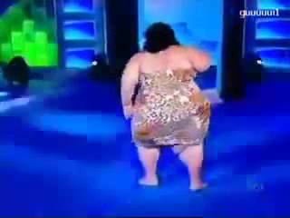 Толстая женщина на сцене танцует.